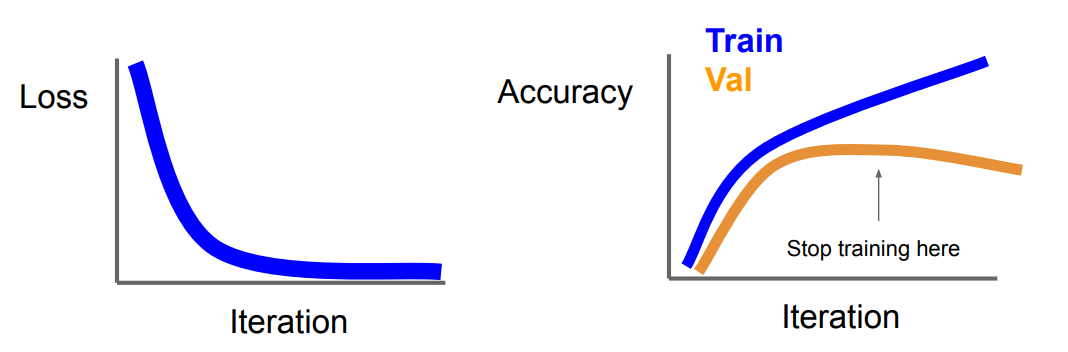 Another way to prevent overfiting is to stop training when the validation accuracy starts to decrease. While training, we typically plot three curves: