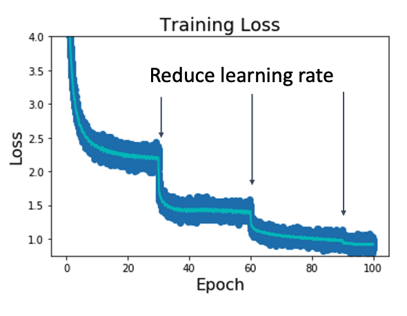 For example, we might reduce the learning rate by a factor of 0.1 after epochs 30, 60, and 90. The learning curve would then look something like this.