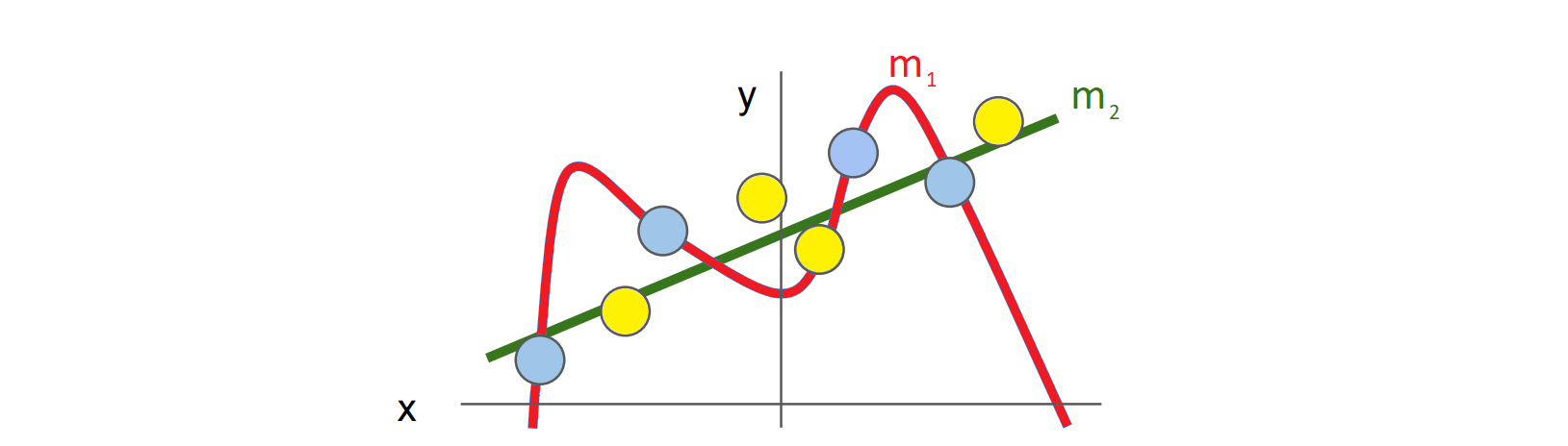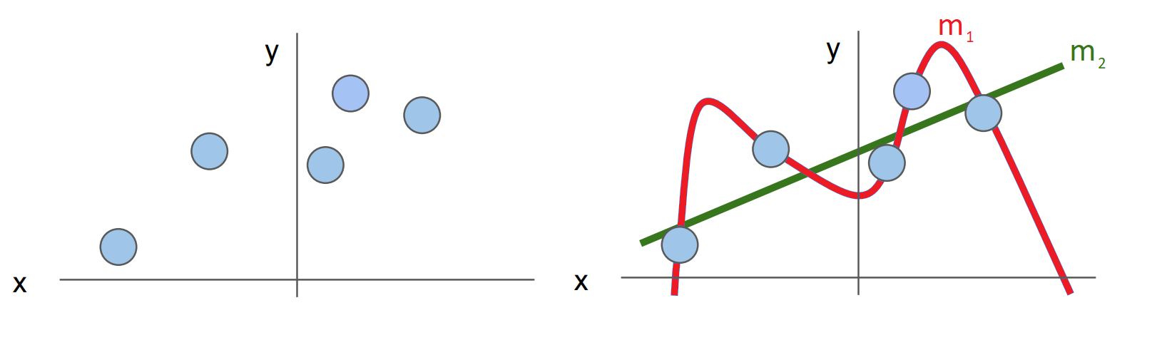 To illustrate this, let’s consider an example. The blue dots in the figure below represent the training data. We fit two models: $m_1$ (a polynomial model) and $m_2$ (a linear model). Model $m_1$ has more layers, leading to a more complex decision boundary that fits the training data almost perfectly.