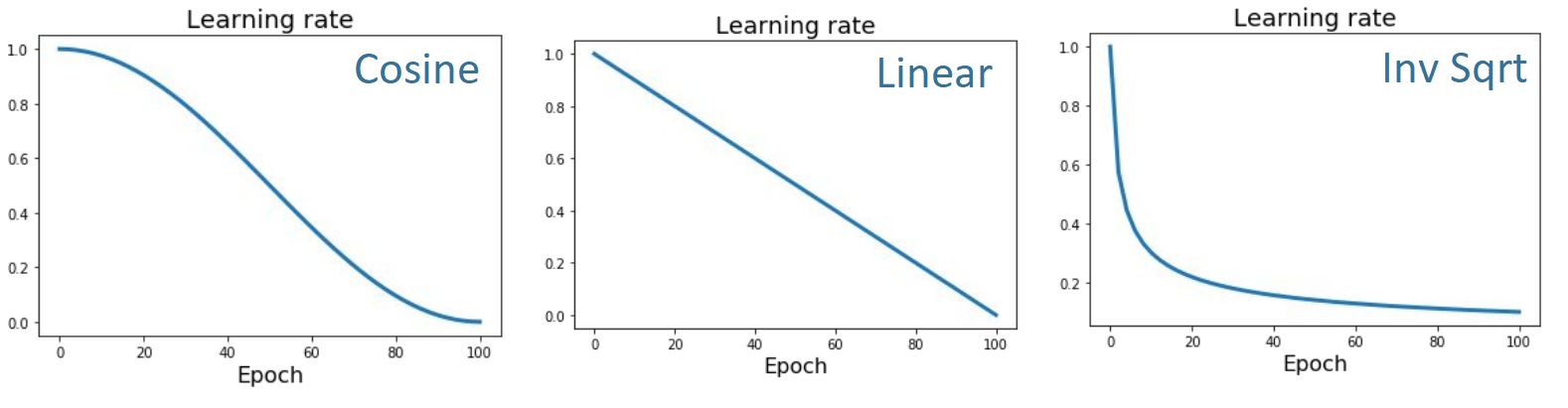 - Inverse Square root: Commonly used in training transformer models, this schedule follows an inverse square root decay. One drawback is that the model spends very little time at the higher learning rate.