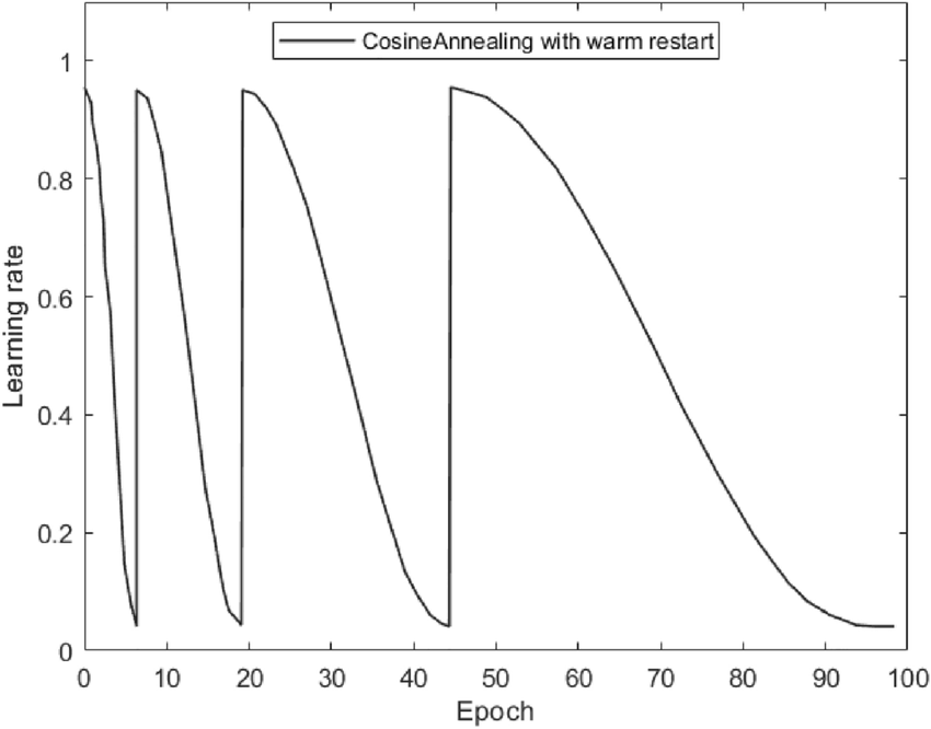 In this approach, the learning rate decreases smoothly within each cycle, following a cosine decay curve. Once the cycle completes, the learning rate “warms up” by resetting to a higher value. This method, also known as Warm Restarts [3], allows the optimizer to periodically explore different regions of the loss landscape.