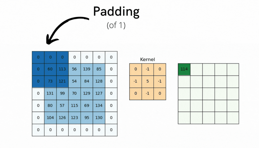 Assuming $H = W$ (square image) and $K_w = K_h$ (square kernel), the output size is given by: $$ W’ = \frac{(W - K_w + 2P)}{S} + 1 $$ where $P$ is the padding size and $S$ is the stride. Let’s understand the significance of these terms.