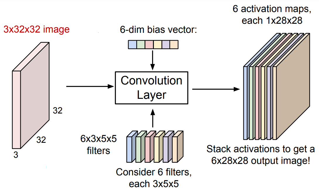 In the example below, a $(3, 32, 32)$ RGB image is convolved with six filters of $5 \times 5$ kernels.