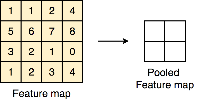 Pooling layers have two hyperparameters: kernel size and stride. For example, consider a max pooling layer with a kernel size of 2 and a stride of 2:
