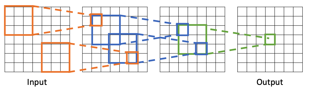 Receptive fields refer to the specific regions of the input data that a feature map responds to. In the convolution shown below, each element of the output layer depends on a $3 \times 3$ receptive field in the input.