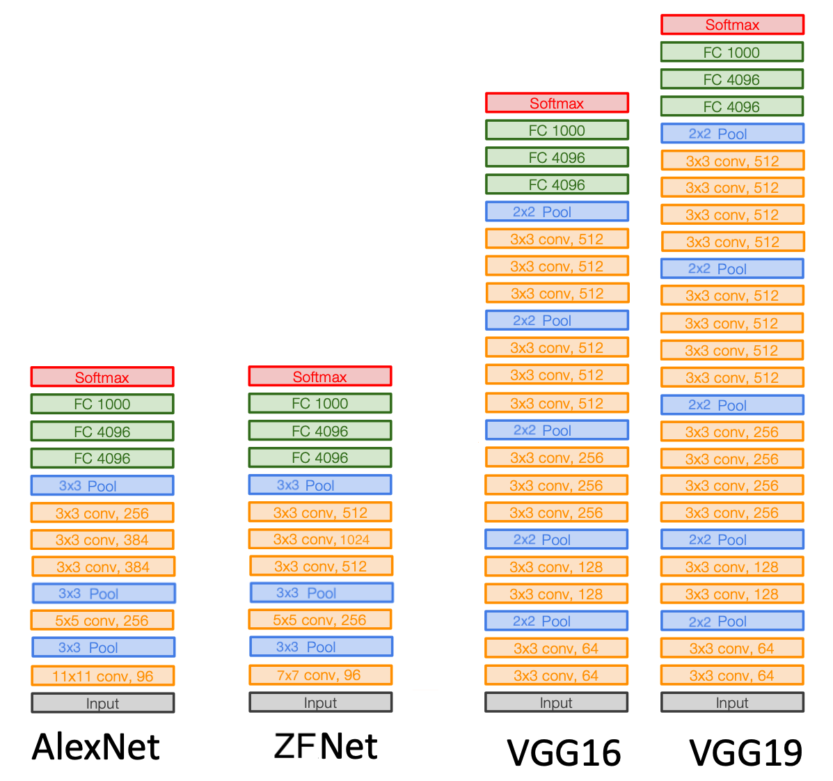 Let’s take a look at a side-by-side comparison of AlexNet, ZFNet, VGG-16, and VGG-19 architectures.