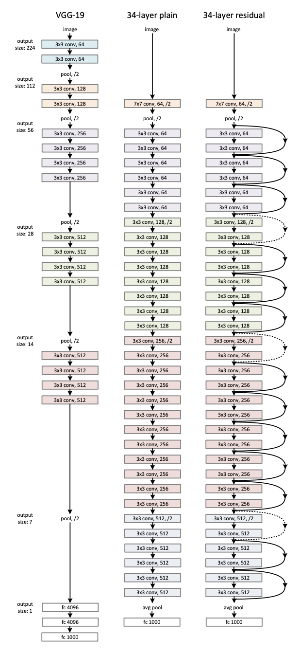 A residual network, or ResNet, is formed by stacking multiple residual blocks. The image below shows a comparison of VGG-19, 34-layer plain, and residual networks.