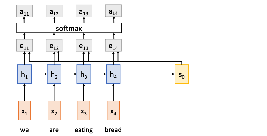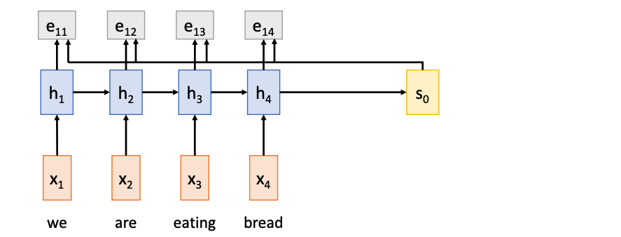 \begin{align} a_{11} [\text{we}] = a_{12} [\text{are}] = 0.45, \\ a_{13} [\text{eating}] = a_{14} [\text{bread}] = 0.05 \end{align}