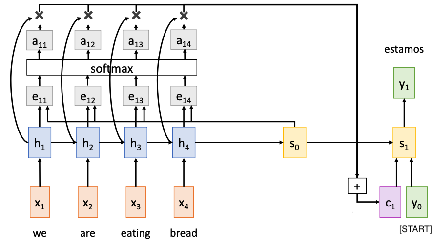 - Update step: The decoder uses this new context vector in the recurrence formula to obtain the next hidden state: