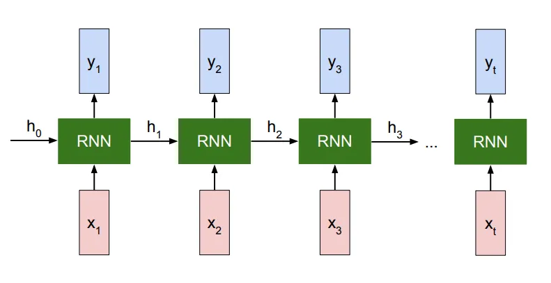 We usually initialize the first hidden state $h_0$ to a zero vector. Note that the same weight matrices are used at every timestep in the sequence. This shared weight setup allows RNNs to handle sequences of arbitrary length by unrolling the computation graph over any number of timesteps, all while using the same set of weights.